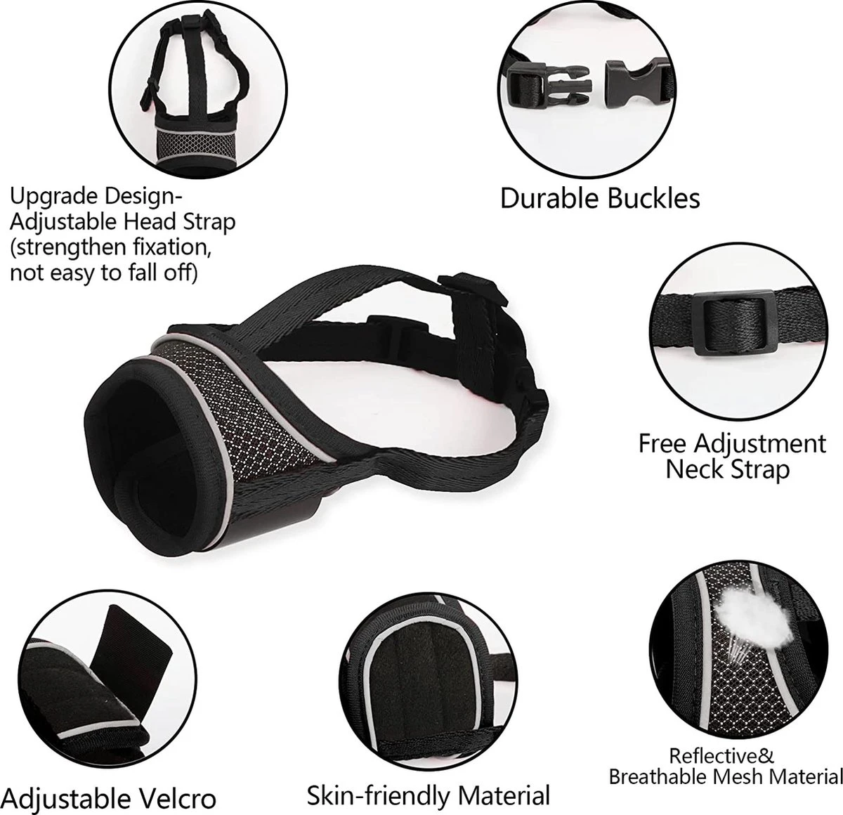 - 【Stabiele Muilkorf】 De uitgangstoestand wordt geleverd met een hoofdband voor extra bevestiging. De met de nekband verbonden hoofdband helpt om de snuit van de hond te fixeren. Nadat de hond gewend is aan het dragen van de muilkorf, kun je dit deel naar wens behouden of knippen