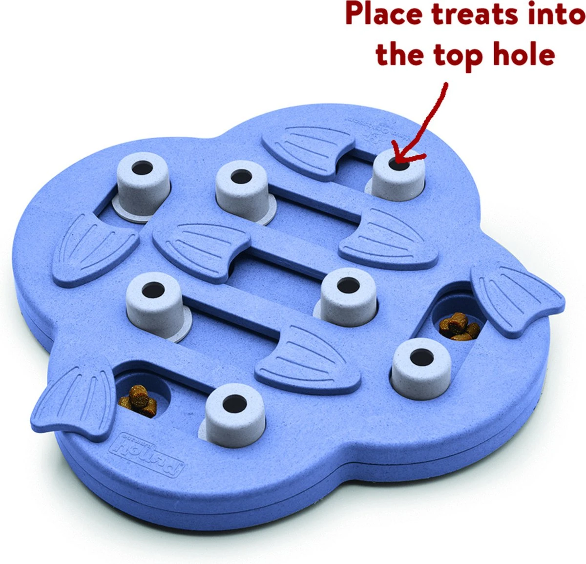 - Laat uw hond eerst gaan zitten en toon hem hoe je het spel vult met brokjes onder de kokertjes en in de uitsparingen.
