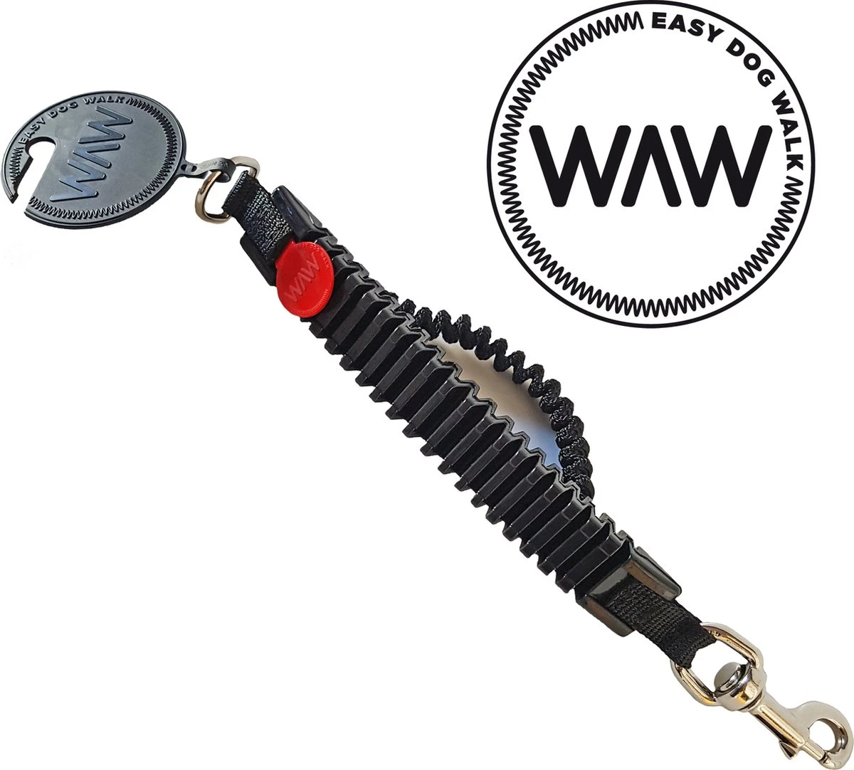 WAW Is het innovatieve anti-schok systeem, gemaakt om (weer) prettig te wandelen met een trekkende of uitvallende hond. Het absorbeert de klappen tijdens trekgedrag en maakt het wandelen met de hond weer een leuk en ontspannen moment.
